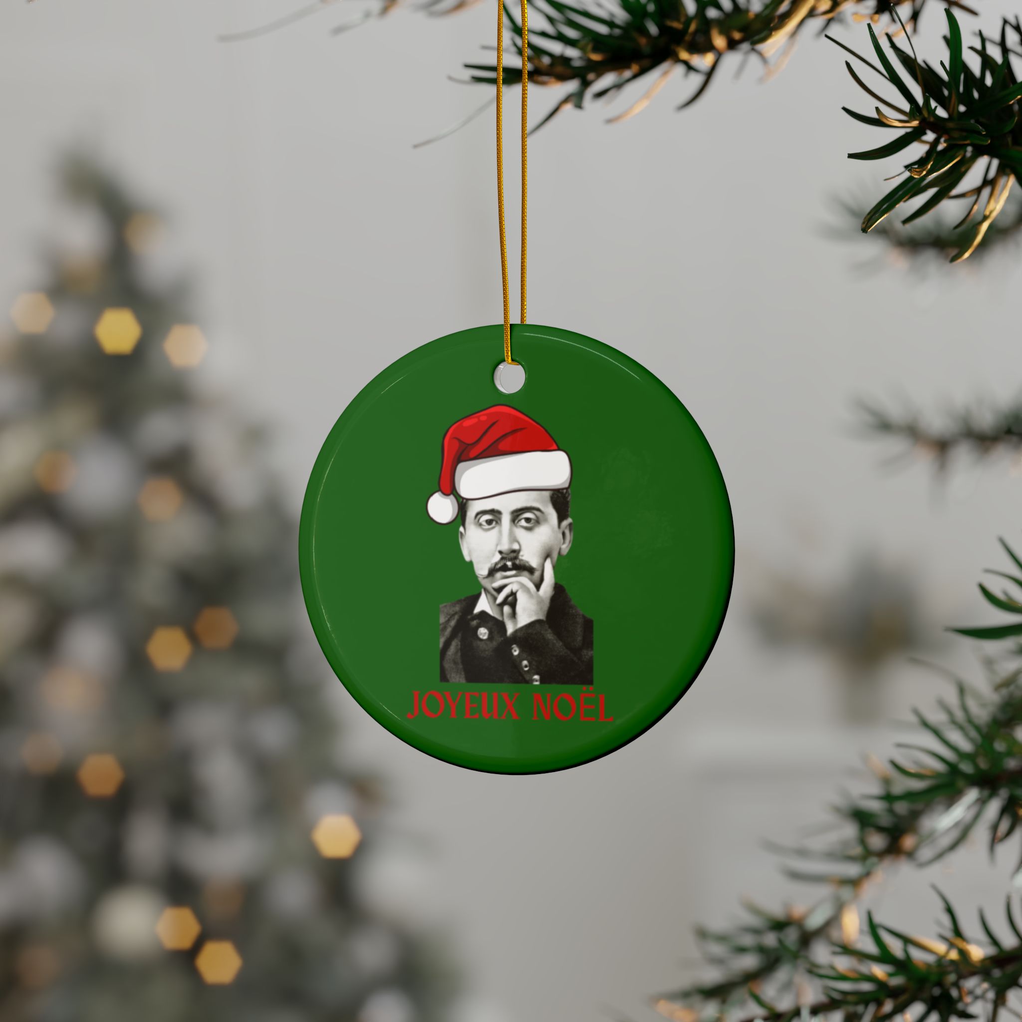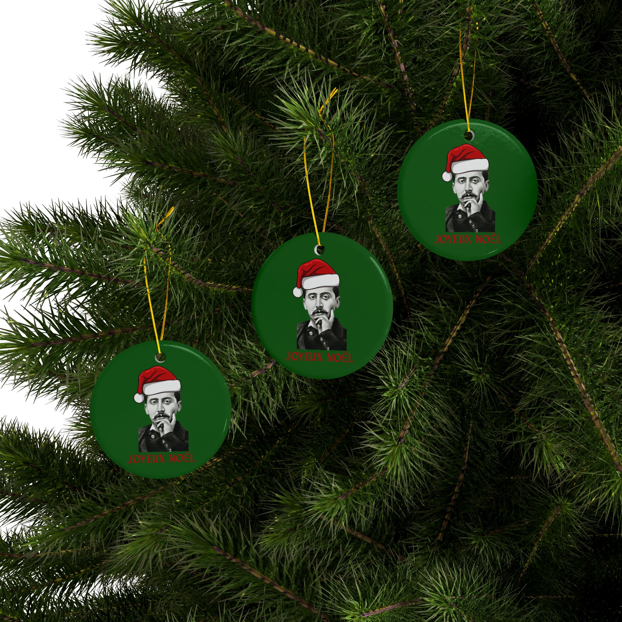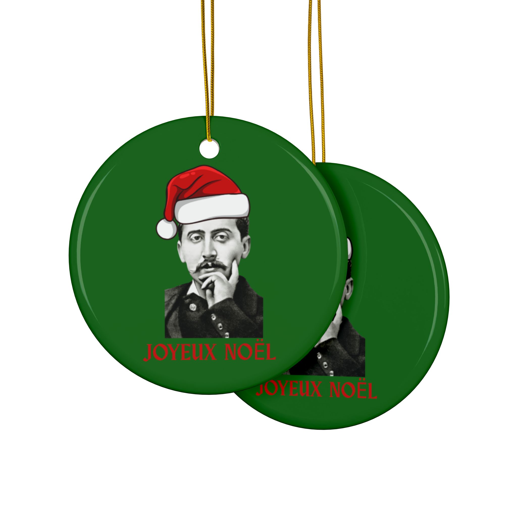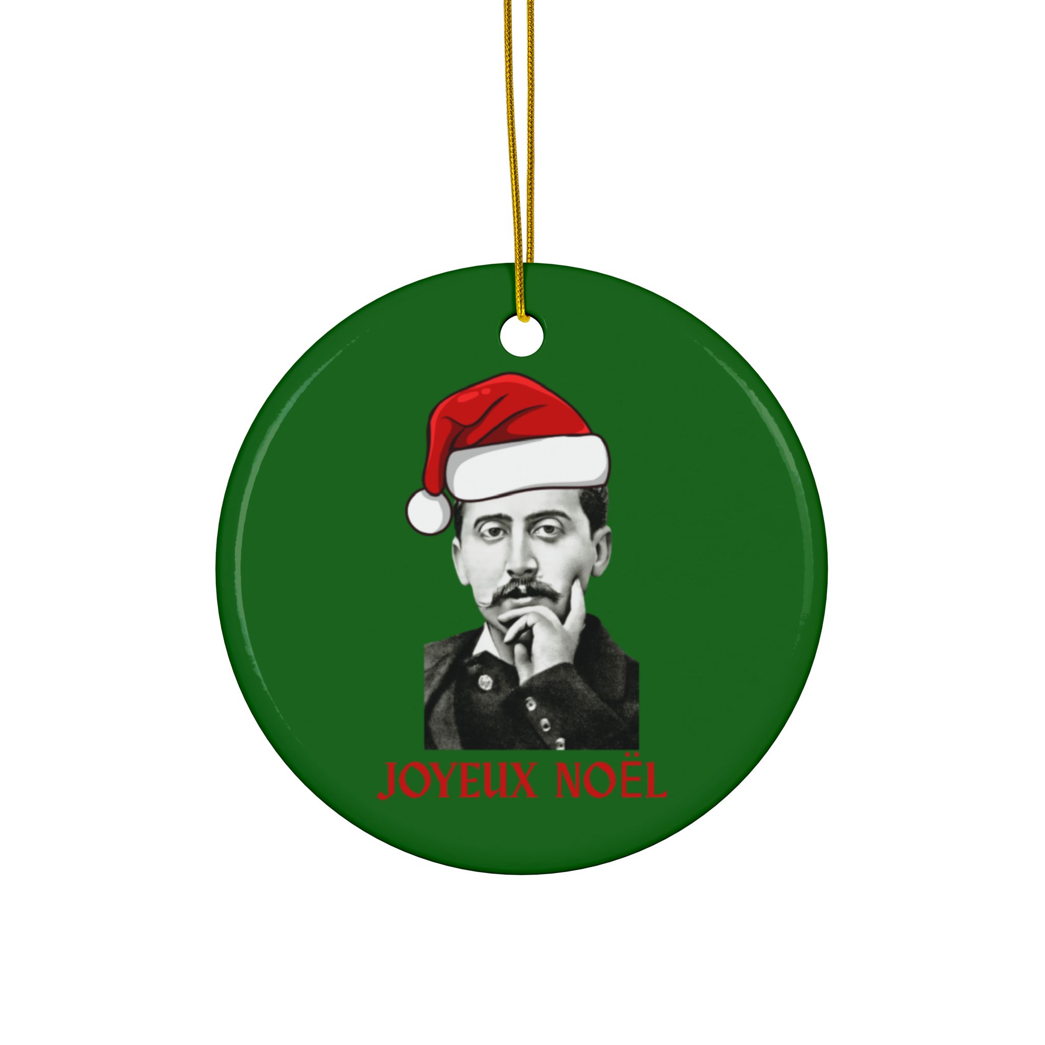 Celebrate Christmas with the great French author Marcel Proust. Each side of the ornament features a graphic of Proust wearing a Santa hat (created using the 1895 photo by Otto Wegener) and a cheerful “Joyeux Noël” greeting. The perfect gift for fans of Proust, French Literatue, or Francophiles in general!